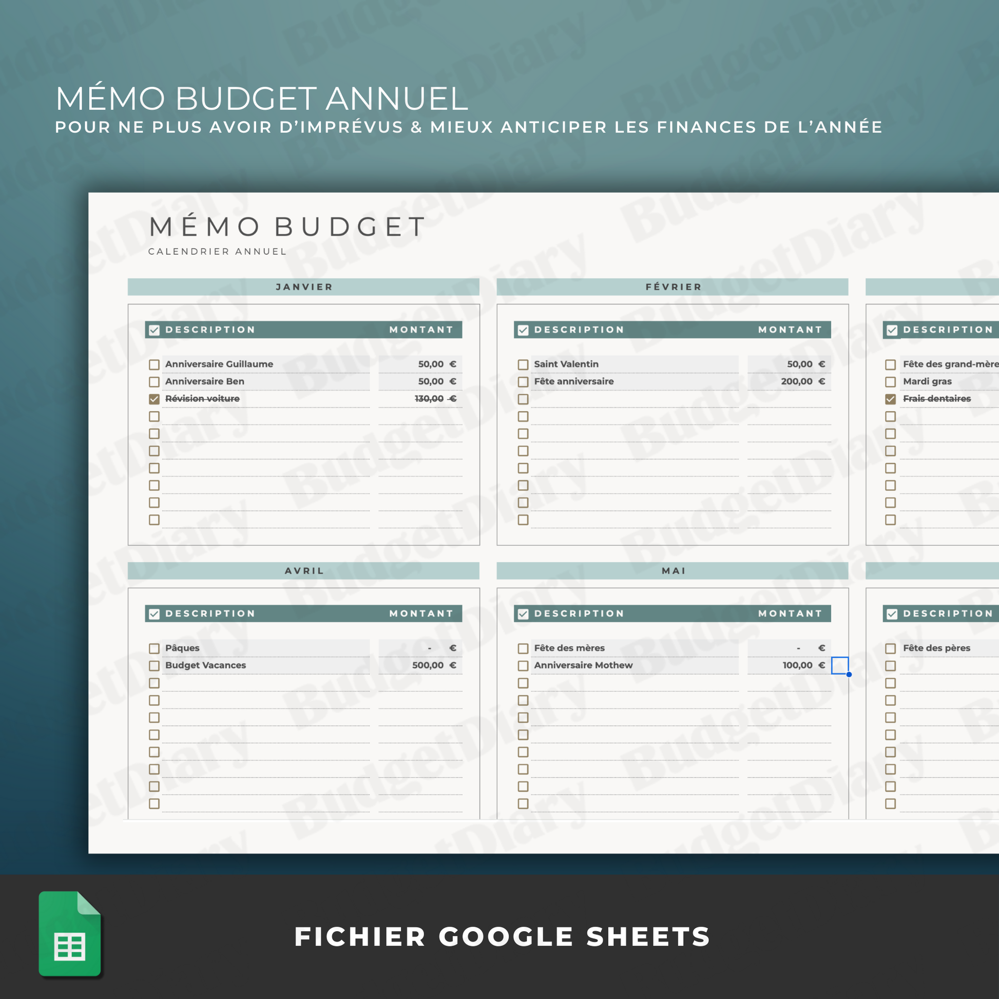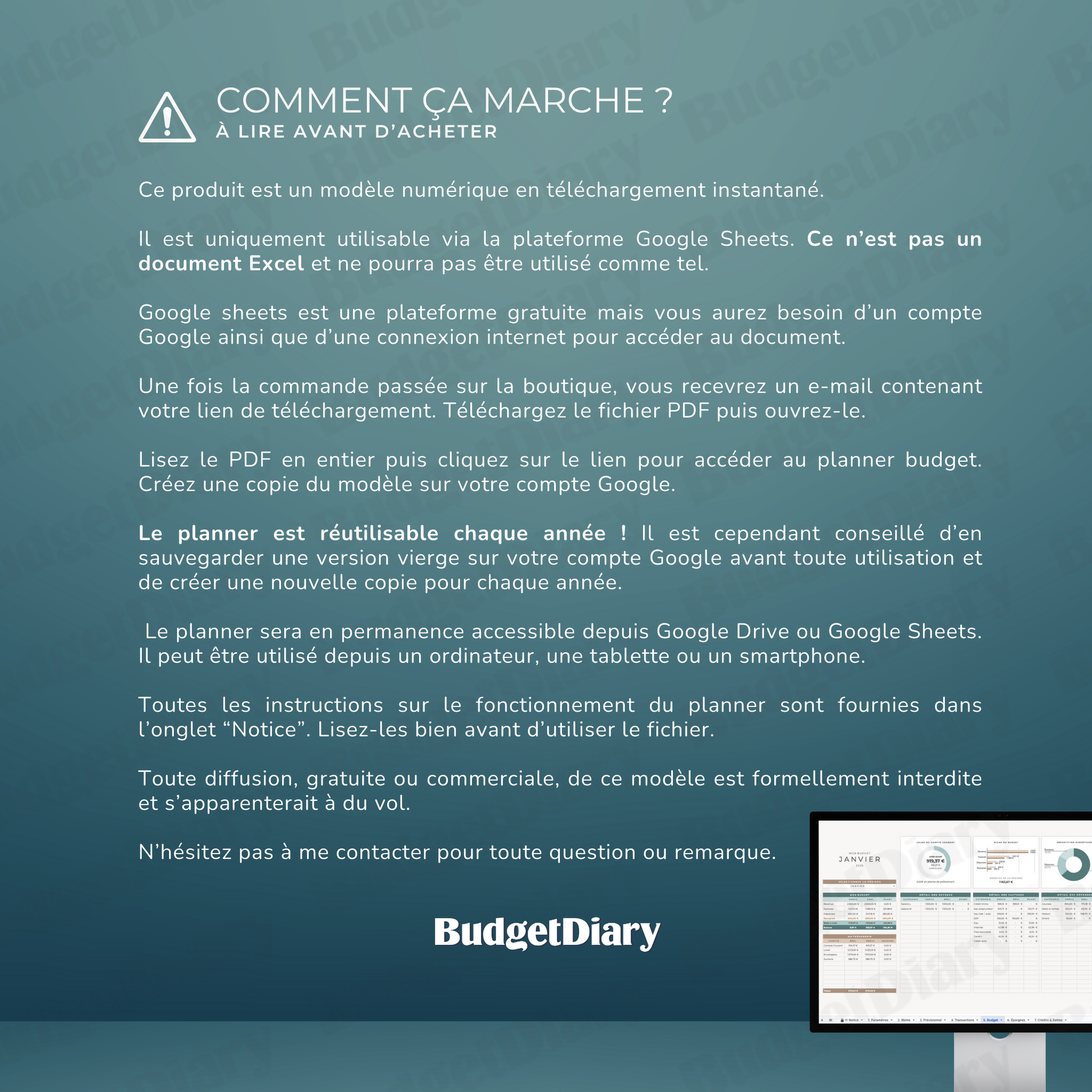 En achetant ce produit vous recevrez par e-mail un lien de téléchargement pour télécharger le PDF d'accès au modèle sur Google Sheets.